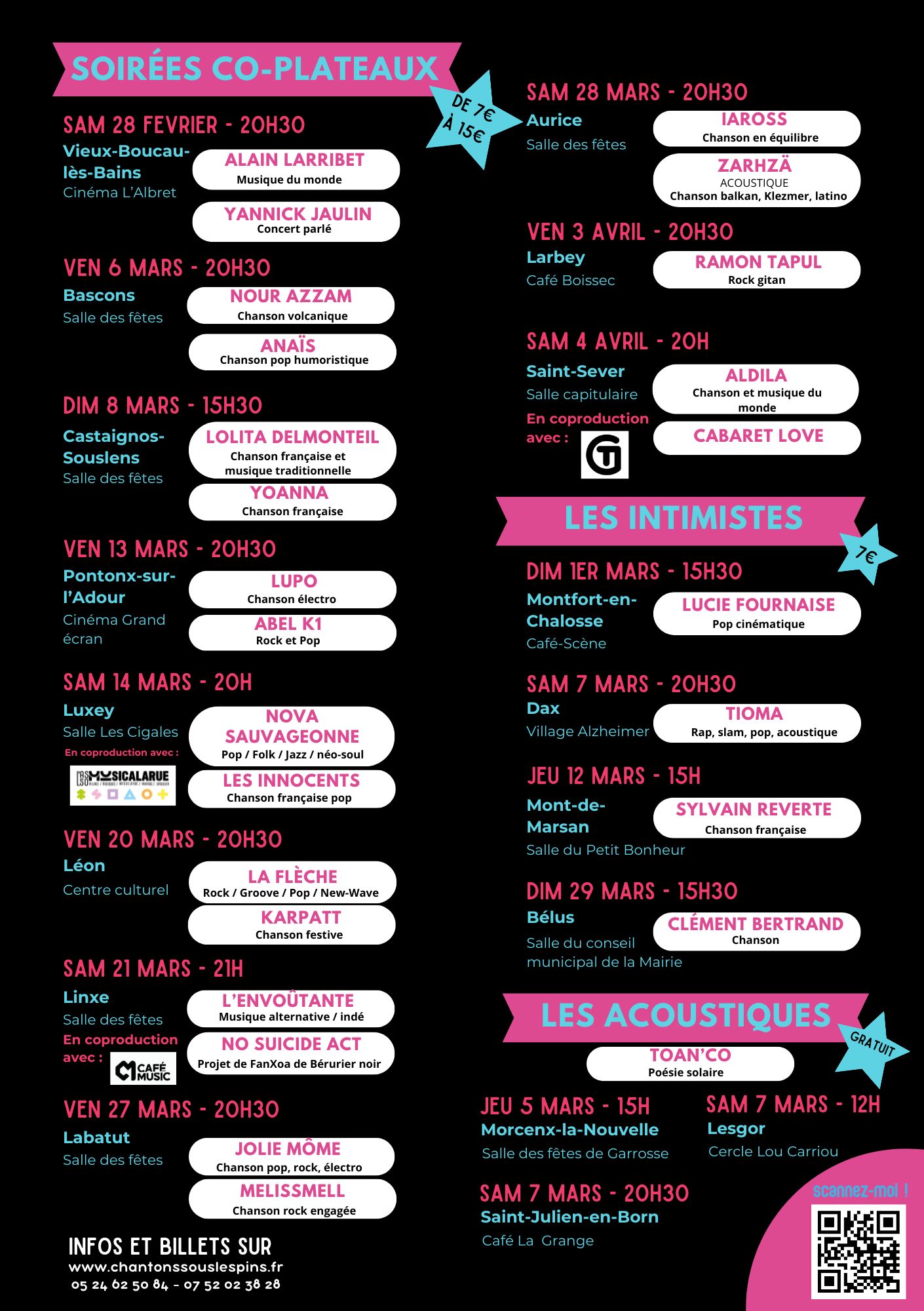 Nous remercions aussi tous nos partenaires de terrain, communes, communautés de communes, associations, radios et médias qui sont à nos côtés pour que rayonne la musique francophone sur notre département du 28 février au 4 avril prochains.